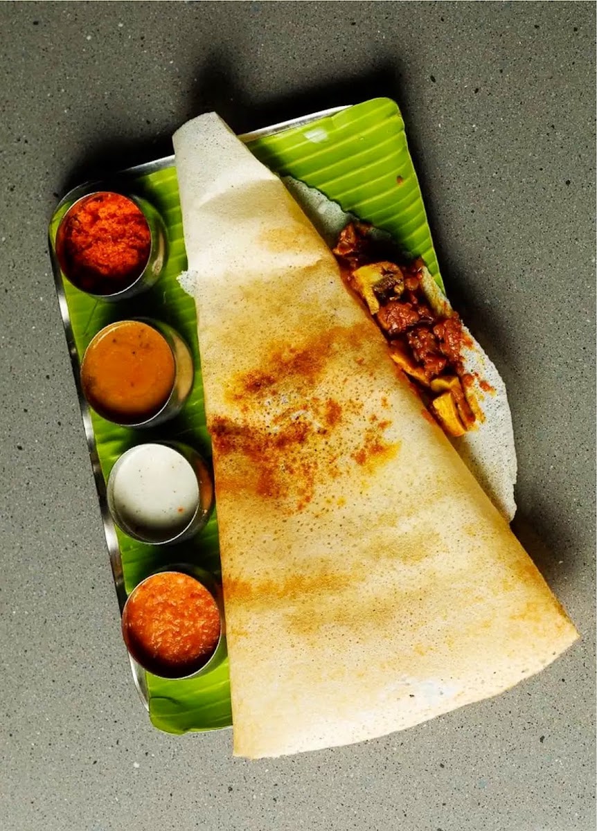 A standout on Aryaas’ menu is the Uttapam. **Try the Podi Uttapam**, a crispy delight made with fermented rice and lentil batter, infused with a spicy podi that gives it a mouth-watering edge. Served alongside flavorful chutneys and sambhar, this dish is a must-try at just ₹126. For something lighter yet equally delightful, the **Tomato Uttapam** offers a tangy twist with its diced tomato topping.